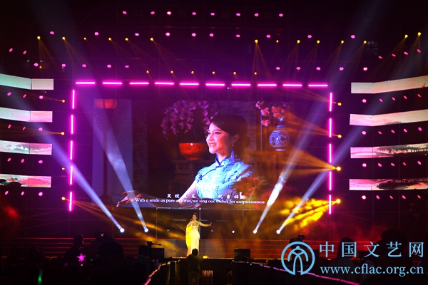 5月26日,“走进美丽兴化·礼赞伟大时代”中国电影家协会文艺志愿服务团慰问演出活动在江苏省兴化市举办。图为陈思思演唱歌曲《满月》、《美好新时代》。中国文艺网 张钰童 摄