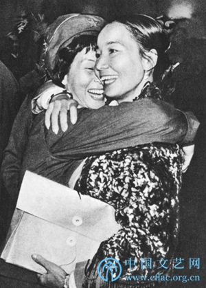 刀美兰(右)和苗族歌手罗秀英在文代会上喜相会。