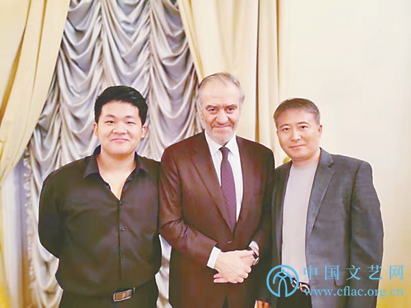 曾韵(左一)与导师温泉(右一)及柴可夫斯基国际音乐比赛组委会主席、俄罗斯著名指挥家捷杰耶夫合影