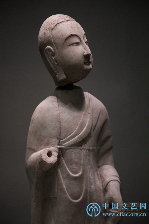 8月6日,“和合共生——临漳邺城佛造像展”在中国国家博物馆开幕。图为展出文物弟子立像。范立 摄