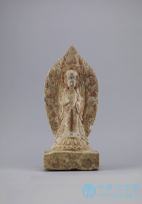 8月6日,“和合共生——临漳邺城佛造像展”在中国国家博物馆开幕。图为展出文物法敬造菩萨像。(邺城考古工作队供图)