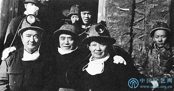 1958年1月15日,中国文联组织在京作家、艺术家50余人到京郊门头沟煤矿参观访问。图为阳翰笙(左二)、高元钧(左一)、梅兰芳(左三)与矿工们在井口合影