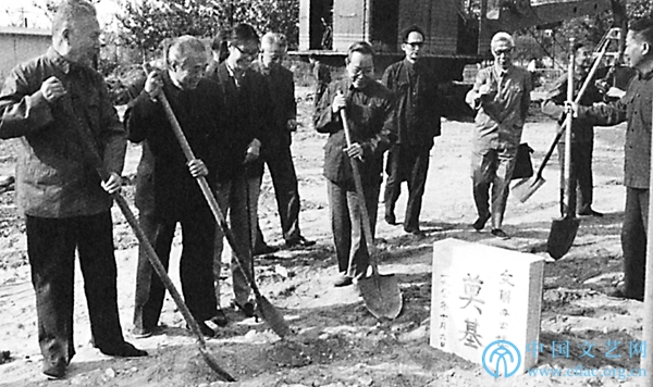 1982年10月6日,中国文联和各文艺家协会负责人,出席中国文联新楼奠基仪式。左起:周扬、阳翰笙、欧阳永华、夏义奎、李庚、迪之、袁文殊、张僖、罗扬
