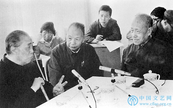 1979年5月24日,阳翰笙(左)在中国曲协常务理事扩大会议上讲话,题为《发挥文艺“轻骑队”的作用——为四个现代化服务》。右起为陶钝、魏伯