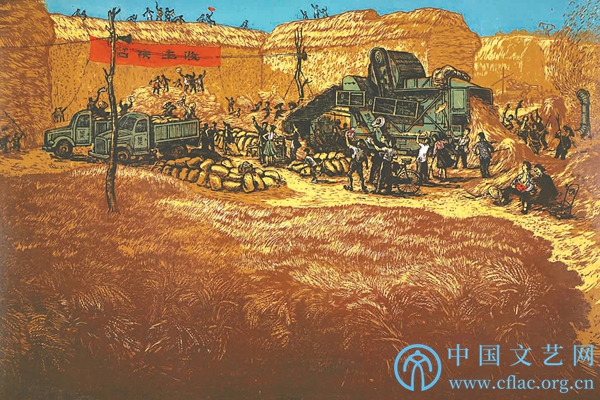 在套色木刻作品《小麦丰收》中,大面积金色耀眼的麦垛与那一抹纯净透彻的蓝天形成强烈反差;他的名作、套色木刻《最后一根钢梁》刀法精细、层次丰富,成为展览现场的一个焦点;中国画作品《夜晚归来鱼满仓》中舟船穿梭,与两岸摇曳的草木相协调,颇具动感。其他作品,如《天台山下》中忙碌于建设的劳动者身影与崇山峻岭形成对比,《晒新棉》里棉花朵朵如白云,《抢救国家财产的王杰》表现了在汹涌的波涛中奋力抢救国家财产的共产主义战士王杰。
