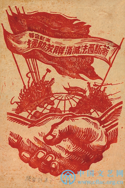 这一时期,武石在《政治情报》《伤兵之友》《战地文化》《力报》《开明日报》《时代》《七七报》等报刊上发表了大量木刻作品和漫画作品。一发炮弹飞向“文化汉奸”——那是武石于1940年创作的单色木刻作品《打击》中的内容;单色木刻作品《到前线去》中,标语“中国人不打中国人”赫然醒目;单色木刻作品《联合起来》号召“援助苏联消灭法西斯蒂”,地球仪的上方是高举着镰刀等武器、呼喊着的人民,一对紧握的手以特写的形式占据了画面下方的近景处,传递着坚定有力的信念;《劳军图》中在“人民解放军万岁”的旗帜的引领下,老百姓们吹唢呐、敲锣打鼓、挑鱼牵羊以及欢乐地进行民俗表演的种种情形集中呈现,创作者的欣喜心情跃然其上。