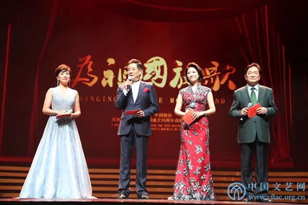 9月4日,由中国文学艺术界联合会、中国戏剧家协会联合主办的“为祖国放歌——中国文联、中国剧协庆祝中华人民共和国成立70周年戏剧晚会”在北京梅兰芳大剧院举行。图为国家一级演员、中国文联副主席、中国剧协主席、二度梅花奖获得者濮存昕,国家一级演员、中国剧协顾问、著名朗诵表演艺术家瞿弦和,国家一级演员、第10届梅花奖获得者王晓梅,中央广播电视总台央视主持人张喆主持晚会。中国文艺网 刘青摄