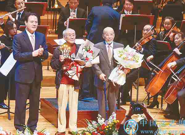 李前光为中国文联、中国音协授予的“终身成就音乐艺术家”曹鹏和郑秋枫两位老一辈音乐艺术家颁发了荣誉证书