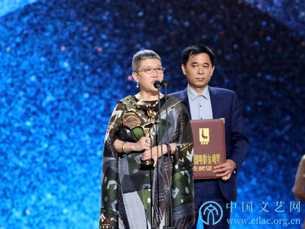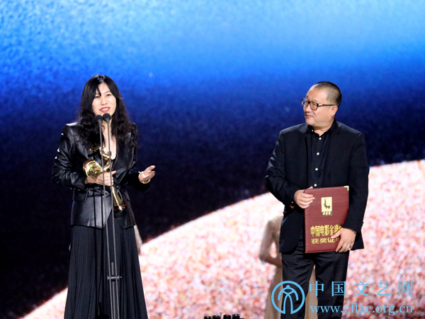 11月23日,第32届中国电影金鸡奖颁奖典礼暨第28届中国金鸡百花电影节闭幕式在福建厦门举行。图为最佳编剧阿美、王小帅(《地久天长》)发表获奖感言。