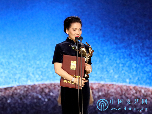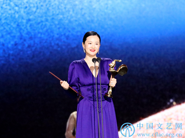 11月23日,第32届中国电影金鸡奖颁奖典礼暨第28届中国金鸡百花电影节闭幕式在福建厦门举行。图为最佳女主角咏梅(《地久天长》中饰王丽云)发表获奖感言。