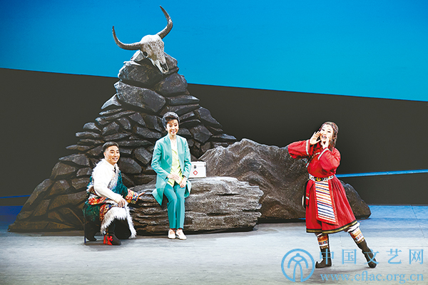 必须提及的是,该剧塑造的主人公是从事现代科学工作的医生,也始终将叙事放置在浓郁的藏地文化特色中推进。雪山、圣湖是自然的标识,佛寺、藏袍、哈达是器物的标识,藏舞、藏歌、藏戏是人的标识。尤其是藏戏说雄,事实上具有了歌队的功能,不仅从形式上增加了神幻、浑朴的藏地文化标识,更重要的是,其唱词以狞厉和空灵映射戏剧情节,点化人物内心,成为戏剧行进的机杼之力。主创人员将理性与非理性凝结于超越性的人格审美和精神氤氲中,创造了高洁的圣灵之域。正是在这样的场域中,那地上的“天使”和天上的彩虹,才互相辉映,合二为一,楚楚动人、撼人心魄。