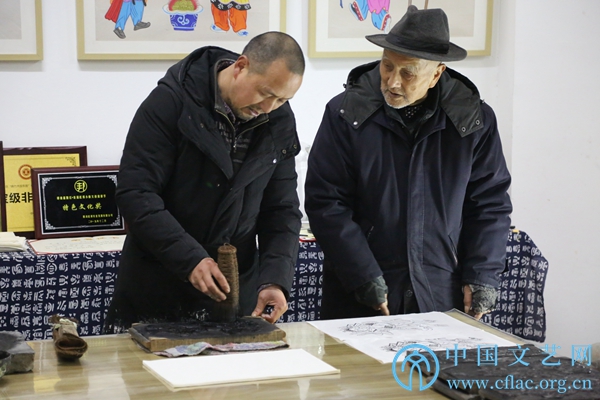 图为李芳福(右)与儿子李道春(左)正在进行创作。中国文艺网 王少杰 摄