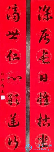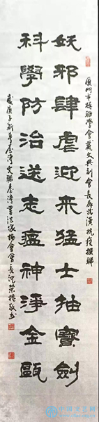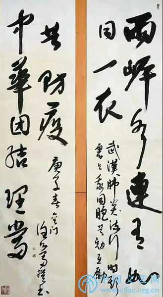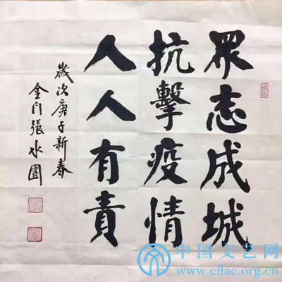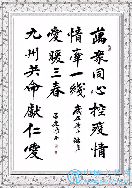 释文:万众同心控疫情,情牵一线;九州共命献仁爱,爱暖三春。
