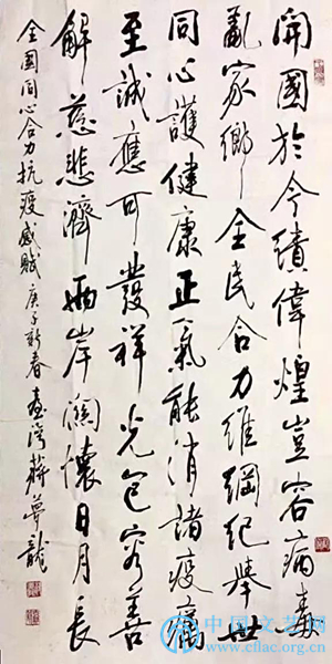 释文:开国于今绩伟煌,岂容病毒乱家乡。全民合力维纲纪,举世同心护健康。正气能消诸疫疠,至诚应可发祥光。包容善解慈悲济,两岸关怀日月长。
