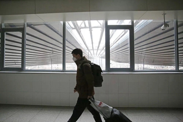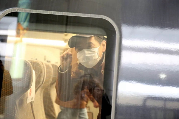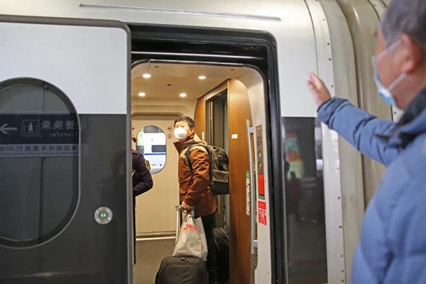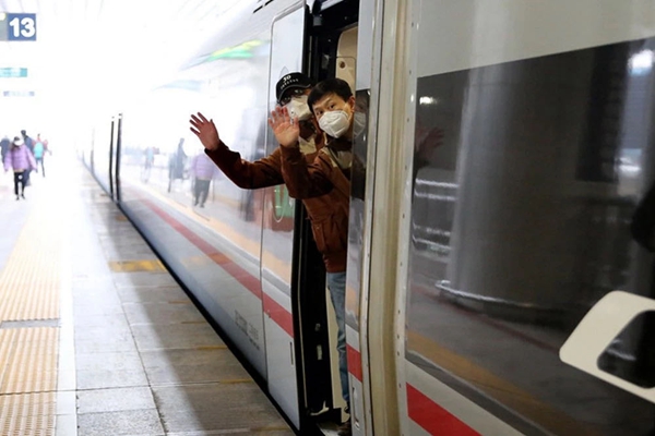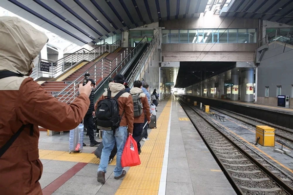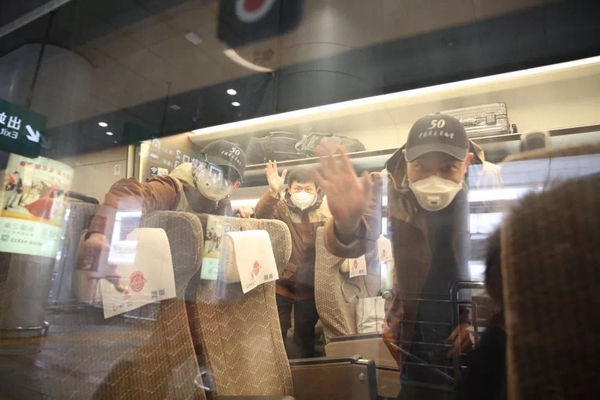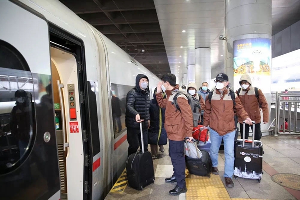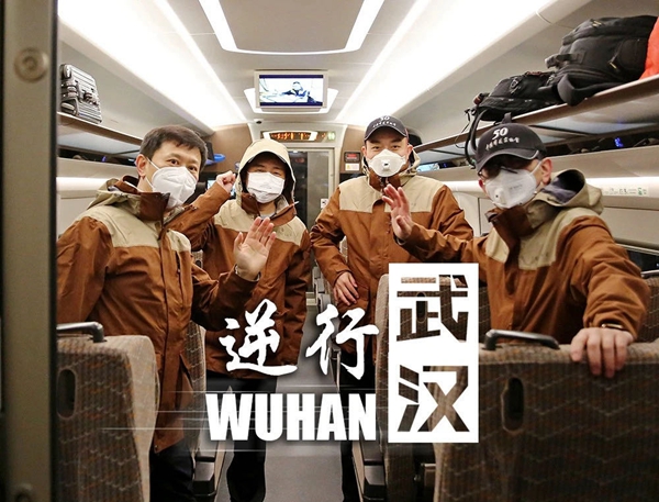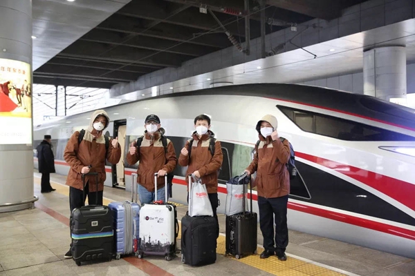 2月20日,中国摄影家协会主席李舸、《中国摄影》报副总编辑柴选、中国文联摄影艺术中心网络信息处编辑陈黎明、中国文联摄影艺术中心主任刘宇(从左至右)踏上开往武汉的高铁。图片设计 瞿潇