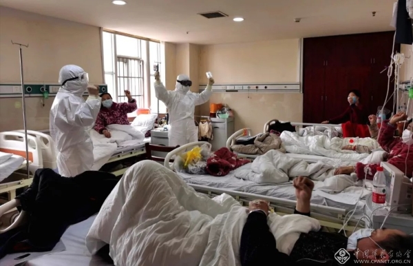 2月13日10:57,病房里传来加油的声音。新冠肺炎的住院病人都比较担心和恐惧,家人又不能陪在床边,护士长和责任护士在病房里告诉他们:“放心!我们是江苏省过来的医护人员,和你们这边医院的医护会把你们治好的。大家一起加油,好不好?”这时,随着护士长举起的手,病人也随着举手喊起加油。贾晓民 摄