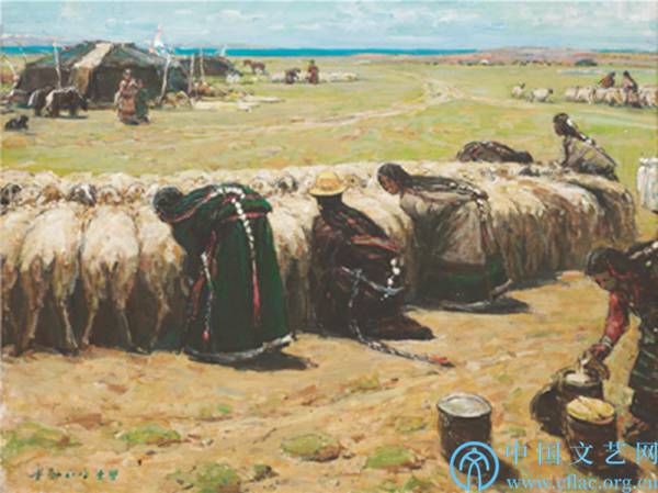 《翻身曲》描绘了有了自己土地的农民,早晨下地劳动时的喜悦; 《朗生的婚礼》记录了两位朗生出身的青年男女婚礼上的热闹场面; 《挤羊奶》描绘了牧草丰美的草原上,藏族少女将奶羊用长绳编结队依次取奶的情景……这其中有一部分西藏地区油画创作是通过速写进行绘画语言转换的,比如2005年的《挤羊奶》是基于1964年的同名速写创作而来。更多的创作并不是直接从对应的速写而来,而是通过潘世勋长期积累的素材再次创作而成的,感情是其中的催化剂。“如果单以一种局外人的、冷冰冰的态度去观察生活那是不够的,艺术家对待生活还要动感情才行。 ”潘世勋说。