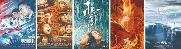 《中国机长》《我和我的祖国》《少年的你》《哪吒之魔童降世》《流浪地球》(从左至右)等一批优秀 的国产电影都在我国的艺术传统、文化传统中吸取了营养。