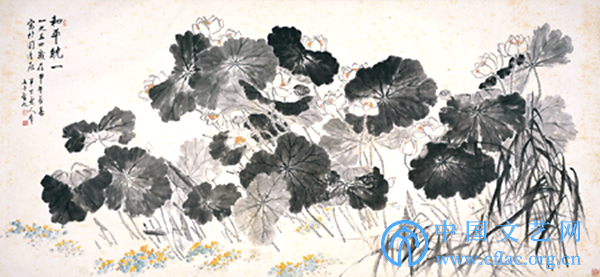 《和平统一》是陈半丁以荷花为题材创作的具有明显主题意义的花鸟画。陈半丁以泼墨大写意绘荷叶,以双钩写花瓣,再以赭色和淡红点染花蕊,制造了一种水墨淋漓、欣欣向荣的氛围。在荷花之外,作者再点缀以五彩斑斓的浮萍,且有芦苇衬景,使画面变得丰满而充满活力。因“荷”与“和”谐音、“萍”与“平”谐音,故陈半丁以此来寓意“和平统一” 。他在画上题识曰:“和平统一,一九五四岁在甲午长春写于闲清居,半丁老人年七十有九” ,钤朱文椭圆印“强其骨” 、朱文方印“半丁老人”和白文方印“山阴陈年章”“富贵何如草头露” 。“闲清居”是陈半丁在京城米粮库四号院居家的一处画室,是其66岁即1941年时,因得书额“闲清居”三字而以此命名画室,并刻“闲清居”印记之。在画幅裱边右侧,陈半丁以红纸书题签曰:“毛主席寿,陈半丁敬祝。 ”据此可知,此画是专为毛主席祝寿而作。在这一年,陈半丁为文字改革的事专门写信给毛主席,毛主席及时回信,希望他多提意见,并对其关心文字改革的热情深感敬佩。在此语境下,陈半丁创作鸿篇巨制的荷花,既有对毛泽东的祝寿之意,又寄托了国事初定,希冀国家和平统一的美好期许。