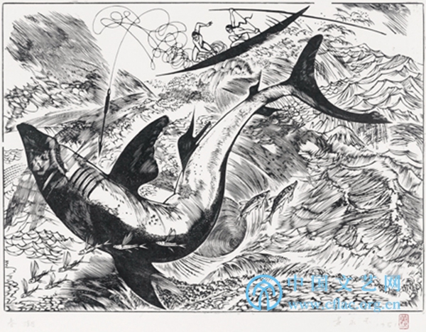 进入20世纪60年代,黄永玉不断拓宽中国新兴木刻的审美与维度,创作了如《春潮》 《花城》 《葫芦信》等代表作品。其版画风格逐渐倾向于一种浪漫美学范式的回归,不仅完善和深刻了中国新兴木刻的形式与内涵,也为当时的版画界带来了一股新风。在王明明看来,黄永玉的版画艺术,特色鲜明,独具异彩。他既不同于当时延安时期革命生涯中成长起来的版画家,也不同于新中国成立之后接受系统学院美术教育的艺术家,这两个体系内的版画家们大多受到西方版画的影响,形成了以素描明暗关系为基调的黑白面貌。“黄老的版画则基于他过人的艺术天资与特殊的成长经历,在吸收了中国传统艺术元素且并蓄现当代漫画和插画诸多的艺术形式之后,他还巧妙地吸收并借鉴西画中的元素纳为己用,从而形成独特的风格面貌和多元的创作格局。黄老的版画大多以线条为主,他对于黑白的运用灵活自如,刀法变换、线面俱下、游刃入木、神而明之。其构思立意新颖绮丽,有感而发且想落天外,画面充满童趣与幽默,形成了清新明朗的意趣和情调。 ”王明明说。