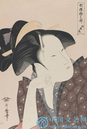 浮世绘由于可以重复印刷,因此价格低廉,普通民众也可以购买。因此浮世绘摒弃了日本贵族艺术的古典趣味,呈现出华丽又略带感伤的唯美世界。尽管浮世绘在题材方面与清代木版年画同样多表现女性、戏剧、风景等主题,但却注重描绘其中的个体的行为活动,对个体的精神世界有所关注。像美人画家喜多川歌麿的《歌撰恋之部·物思恋》 ,这部于1793年起发表的《歌撰恋之部》是浮世绘美人画的划时代之作,画家通过表情与动态上的细微差异反映不同女性恋爱的感觉,同时以纤细高雅的笔触绘制以脸部为特写的胸像,探究女性内心深处的美。在《歌撰恋之部·物思恋》中,喜多川歌麿以灰紫、浅褐、淡黄构成主色,柔和淡雅,风格迥异。作为鸟居派第四代传人的鸟居清长笔下的美人形象大多来自江户市井妇女,从《三女梳妆》可见,他突破美人画纤弱、娇柔,将人物身体拉长,塑造出健康颀长的女性形象。