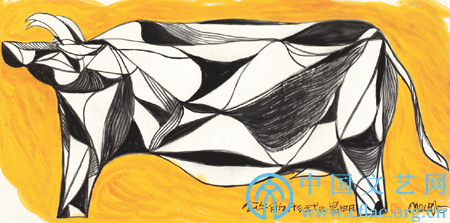于是,看似简单的线条蕴含无穷的变化。 《莲语》系列中,柔软而夸张的线条使莲叶有了蓬松的姿态; 《公牛》系列里,不同线条的排列组合配合色块使画面带有强烈的视觉冲击力;而《窑变》系列,质朴的线条让画面回归童真,是艺术家追求返璞归真的个人情趣。如葛玉君所说: “正是对这样一系列的线条进行研究,综合起来提炼出他所认为的一种‘线’的元素。在我个人看来,既包含着对传统笔墨线条的‘去魅化’的过程,也内含着对表现性线条的一种‘复魅化’的过程。 ”