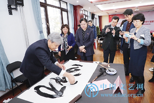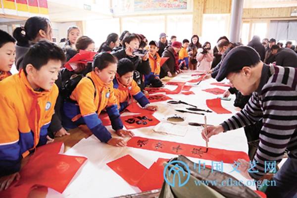 “百县千村”书法惠民志愿服务活动是自2011年以来,山东省书协贯彻落实中央和省委有关精神,深入践行文艺界核心价值观,进一步满足人民群众对美好生活的向往,在层层调研、广泛听取基层群众意见的基础上开展的具有开创性的书法惠民活动。该活动每年12月28日同时同步在全省16市的130多个县市区各地域,以及文教卫、工矿企业、驻鲁部队等各领域基层单位全面展开, 9年来累计开展活动5800余次,发动书法家23000余人次,为基层群众书写作品32万余件,春联57万余副,开设“王羲之书法大讲堂” 900余场,培养基层书法骨干2 . 5万人次,惠及书法爱好者、基层群众近400万人。此项活动是目前山东文艺界举行的历时最久、规模最大、影响最广的文化惠民活动。