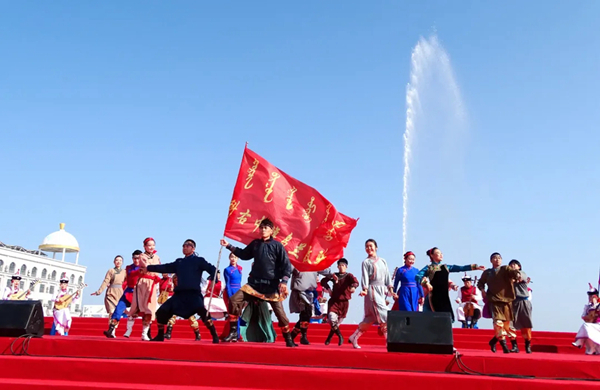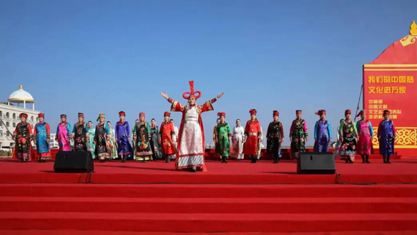 “我们的中国梦”——文化进万家中宣部、中国文联文艺志愿服务队走进内蒙古科右中旗主场慰问演出现场。图为蒙装走秀《蒙古游牧》(图片来源:科右中旗发布)