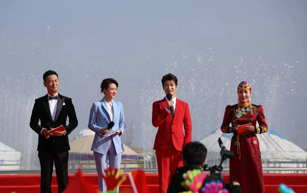 “我们的中国梦”——文化进万家中宣部、中国文联文艺志愿服务队走进内蒙古科右中旗主场慰问演出现场。图为主持人张蕾、尹颂、正一、都来花(图片来源:科右中旗发布)