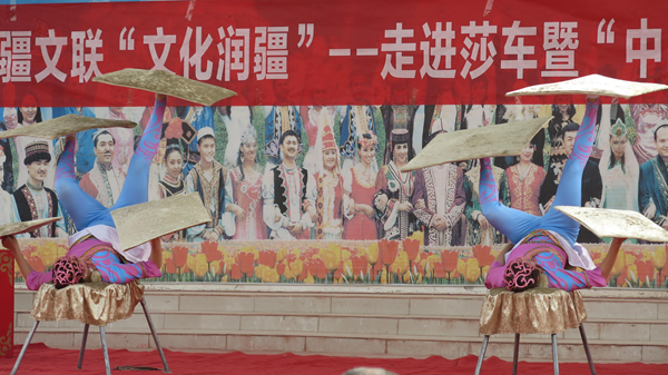 新疆杂技家协会的黄欣梅和阿依古丽.吐鲁洪在萨依巴格村表演杂技《蹬技》