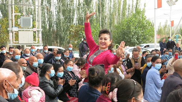 德艺双馨,人民喜爱的艺术家迪丽娜尔.阿不都拉在萨依巴格村和村民共庆丰收