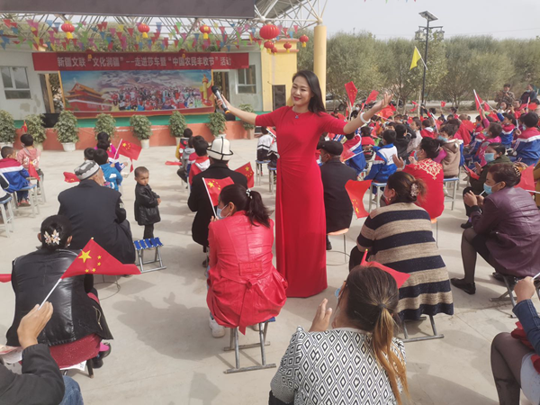 新疆电视艺术家协会的古丽巴合尔.肉孜在阔什铁热克村表演的独唱《一朵花》和《想念》