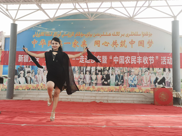 中国著名舞蹈家 迪丽娜尔.阿不都拉在萨依巴格村表演舞蹈《心连心》