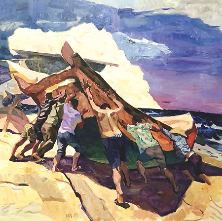 “光与色的关系,向来是油画家必须面对的课题。但北回归线上直射的阳光,让油画家调色板上的色彩序列发生了变化,即便是灰色也变得很亮。 ”中国艺术研究院美术研究所副所长郑工说。因而,在吕峰的《东兴边贸风情街》 《东兴渔民》等作品中,粗粝的笔触描绘出阳光下的城市街道和水边劳作的渔民,透溢出强烈的光感与热度;刘瑞森的《凤梨小摊》以红色主调铺染街头小摊,棕黄与深黑色的凤梨、行走的人,色彩大胆而充满南国风情;韦明思《侗族月夜》系列曾经在全国性展览中多次展出,表现侗族山寨间的歌舞盛会,每家每户的窗户透出灯光、出现不同的剪影,中心广场有篝火晚会,夜色迅速围拢,黑黝黝的屋顶占据画面的大部分空间,形成散漫的光与建筑,勾画出秘境。一如中国美协美术理论艺委会主任、 《美术》杂志社社长兼主编尚辉所言,北回归线油画群体作品中强烈的阳光感,不是印象派的用光,更有主观的色彩表现。
