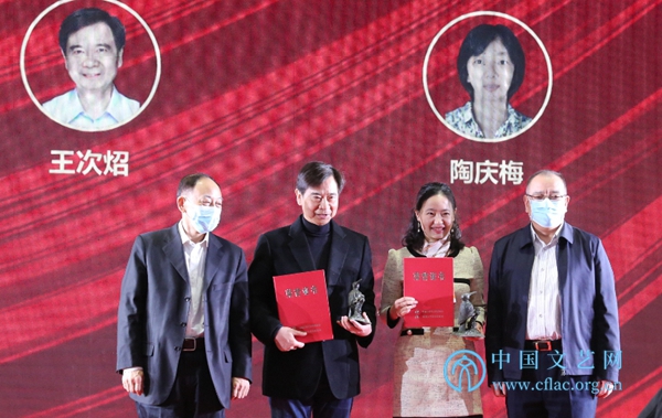 中国文联党组成员、书记处书记、中国文艺评论家协会副主席董耀鹏,中国文艺评论家协会主席夏潮为第五届“啄木鸟杯”中国文艺评论年度推优优秀著作作者代表颁发青铜“啄木鸟杯”。 中国文艺网 胡艳琳摄