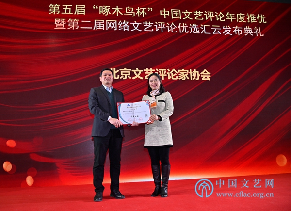 中国文联文艺评论中心主任徐粤春为第二届网络文艺评论优选汇优秀组织代表颁发证书。 中国文艺评论家协会供图
