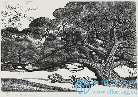 王琦先生介绍他的作画三过程:第一步用焦墨以素描方式画出事物形态、不同层次的色调与明暗部位;第二步以淡墨和水晕染出画面的水墨效果;第三步施以不同的色彩。“计白当墨论”是水墨画的基理,版画创作与水墨创作的黑白处理是相通的,王琦先生毕竟受过系统的西画训练尤其讲究造型的严谨和变化,他有很好的书法修养,能像使用硬笔和刻刀那样熟练地驾驭毛笔,但他从不刻意追求笔笔中锋,喜用焦墨和侧锋,这样便于造型,书法成为版画家转向水墨画的骨肉,水的活用成为版画家转向水墨画中的血脉。王琦先生的水墨画敏于大块黑白的处理和黑色线条的力度,常用直线、曲线的同向性排列,达到强化形象的动势和节奏感。他的水墨山水画不拘于传统山水画“一河两岸”和各种皱法程序,水墨更不是黑白版画的简单转换,它着力于民族文化的现代化,而不是简单地复制古董。