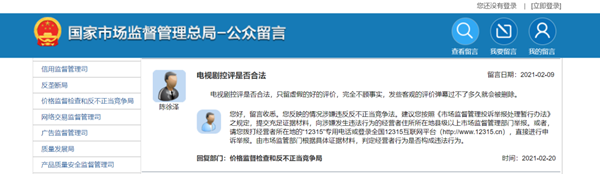 近日,有网友在国家市场监督管理总局官网留言反映,电视剧控评是否合法,只留虚假的好的评价,完全不顾事实,发些客观的评价弹幕过不了多久就会被删除。
