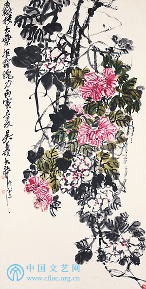吴昌硕40岁时拜任伯年为师,他在纸上仅画了寥寥数笔便让任伯年看到了金石味,任伯年说他书法功底深厚,不妨以篆书的笔法画花卉、草书的笔法画枝干,“变化贯通,不难其奥诀也”。尽管吴昌硕“没有任伯年绘画上的那种灵巧秉赋,他的技巧和题材范围也没有什么不同寻常之处,但他是一位强有力的艺术家。他以符合书法要求的笔墨为基础,运用海上画派典型的形和强烈的色彩去组织构图,完美地将诗与画统一起来。诗如此经常地与画相伴,有时还决定着画面。他的早期作品色彩十分丰富,随着年龄的增长,他的笔墨愈发苍劲。”著名汉学家、艺术史学家迈克尔·苏立文认为。