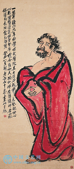 在吴昌硕平生所作最大人物画《达摩像》中,中锋石鼓线条果敢、潇洒、厚实,挥就出的几条衣纹醇韵十足,犹可见其手持椽笔的气势。画中虽未见石鼓字,但石鼓气韵却扑面而至,以重、拙、大的力量感形成意趣;而在《芙蓉拒霜图》《叠石兰花图》等写意花卉中,这种金石之功也得以体现。就像吴昌硕自己所说:“我平生得力之处在于能以作书之法作画。”