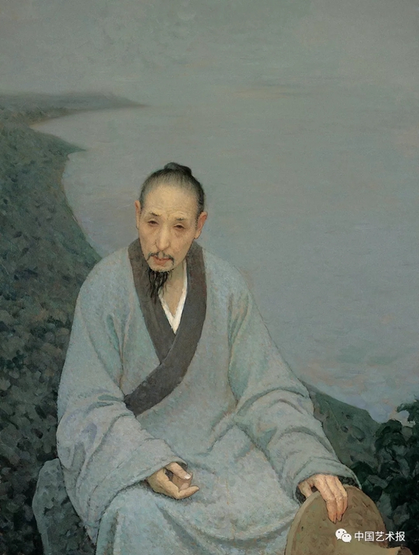 以《青年女歌手》等作品为标志,就在上世纪80年代,靳尚谊孜孜以求的古典主义绘画语言风格趋于成熟。《画家黄宾虹》《晚年黄宾虹》《髡残》《八大山人》等诸多作品展现了中国意韵与风格——宾虹先生的墨韵、髡残上人的禅味、八大山人的冷逸;作品更近似于古典主义、印象主义和现代主义三种语言风格的折中:人物的背景是一大块抽象的空间,由中国水墨式的点构成,恰如其分地烘托了黄宾虹、髡残和八大的艺术思想、语言风格与个人性情;同时,靳尚谊在用笔上从背景延伸到人物的衣服上,以点写代替扫笔,特别是画面上层次丰富的灰调子,使油彩与水墨有了浑然一体之感。