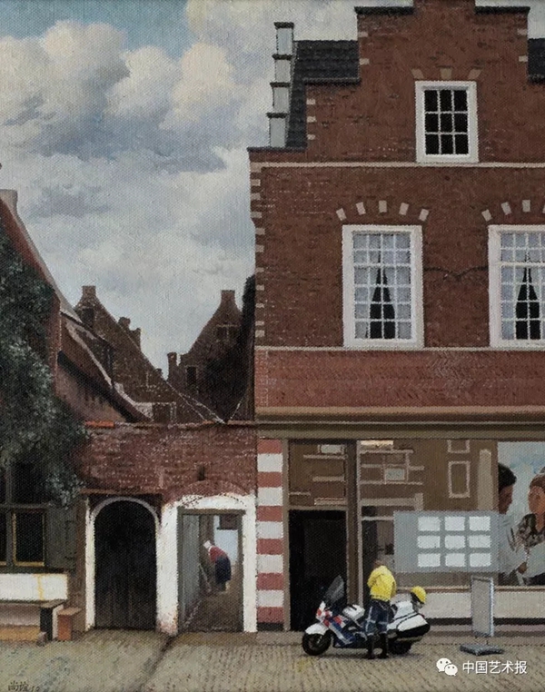 他强调,对维米尔,他是“挪用”而非“临摹”:“‘少女’加了一只手,表情变了,尽管看起来和原作很像,但实际上有变化。另外两张风景,构图一样,但我加了一些新的东西。”