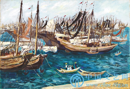 回国后的梁运清在中央美术学院油画系董希文工作室担任素描和色彩课教学。在严谨执教的同时,他开始思考如何将国外所学与国内人民生产生活结合起来。利用课余时间,梁运清到广东、陕北等地做了大量写生,在生活中体验、积累,受到了源头活水的洗礼、陶冶,开拓了新视野,积累了丰富的生活知识和创作素材。《渔港》便是创作于在广东写生时期的油画作品之一,画面色彩单纯明亮,蓝色的海与棕色的船对比强烈,线条勾勒出的船帆与固定桅杆的绳索令画面显得结构严密、层次丰富,反映出了南方独特的生产方式。