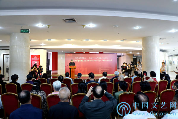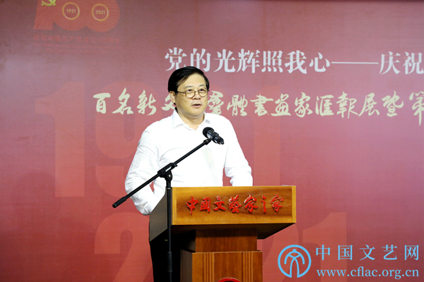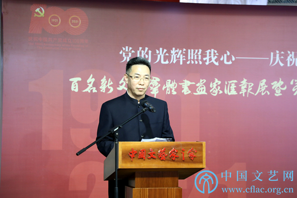 9月23日,“党的光辉照我心——庆祝中国共产党成立100周年百名新文艺群体书画家汇报展暨第三届新文艺群体书画家优秀作品展”在中国文艺家之家展览馆开幕。图为中国美协分党组书记、驻会副主席徐里致辞。中国文艺网 高森 摄