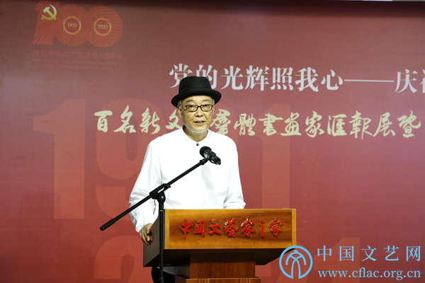9月23日,“党的光辉照我心——庆祝中国共产党成立100周年百名新文艺群体书画家汇报展暨第三届新文艺群体书画家优秀作品展”在中国文艺家之家展览馆开幕。图为中国书画家联谊会主席舒乃仁主持开幕式。中国文艺网 高森 摄