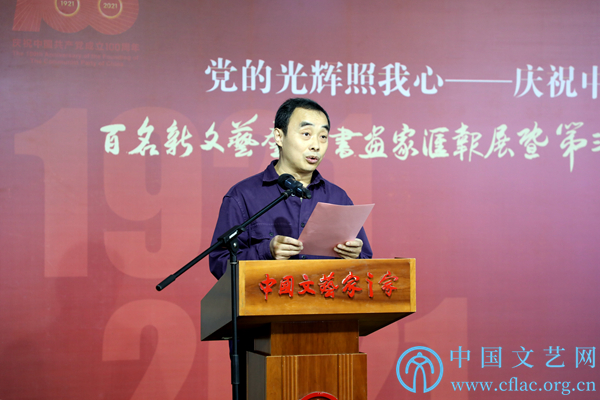 9月23日,“党的光辉照我心——庆祝中国共产党成立100周年百名新文艺群体书画家汇报展暨第三届新文艺群体书画家优秀作品展”在中国文艺家之家展览馆开幕。图为新文艺群体书画家代表王迪发言。中国文艺网 高森 摄