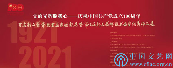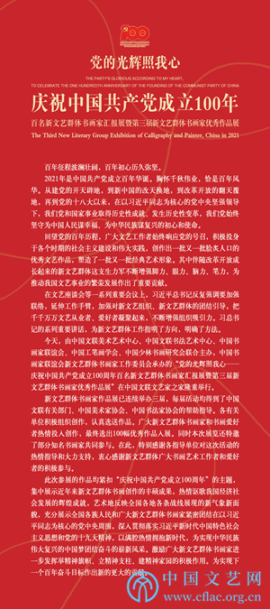 9月23日,“党的光辉照我心——庆祝中国共产党成立100周年百名新文艺群体书画家汇报展暨第三届新文艺群体书画家优秀作品展”在中国文艺家之家展览馆开幕。图为展览海报。