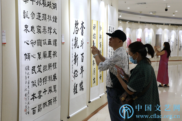 9月23日,“党的光辉照我心——庆祝中国共产党成立100周年百名新文艺群体书画家汇报展暨第三届新文艺群体书画家优秀作品展”在中国文艺家之家展览馆开幕。图为展览现场。中国文艺网 高森 摄