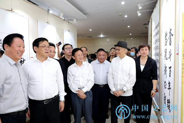 9月23日,“党的光辉照我心——庆祝中国共产党成立100周年百名新文艺群体书画家汇报展暨第三届新文艺群体书画家优秀作品展”在中国文艺家之家展览馆开幕。图为中国文联党组成员、副主席徐永军,中国美协分党组书记、驻会副主席徐里等参观展览。中国文艺网 高森 摄
