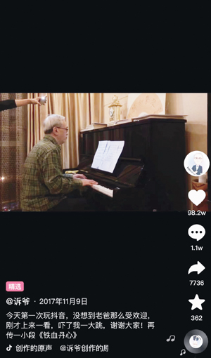 “抖音向我推荐了我的大爷,天哪,不看不知道,70多岁的大爷居然已经有1万多粉丝。从农村小学退休后,大爷购买二胡、攒乐器班子,在抖音上发视频、交朋友、分享音乐,退休生活丰富多彩。”字节跳动员工“小明同学”说。字节跳动员工“jia同学”也说:“奶奶72岁了,虽不识字但也丝毫不妨碍她玩抖音。她喜欢制作特效、拍摄花草,每每玩得不亦乐乎。更不可思议的是,我爸也开始刷抖音,还跟奶奶一起极其认真地讨论如何涨粉。远在他乡上班的我,每天都能在抖音上看到爸爸和奶奶,祖孙三代就好像在一个平行时空相聚。”